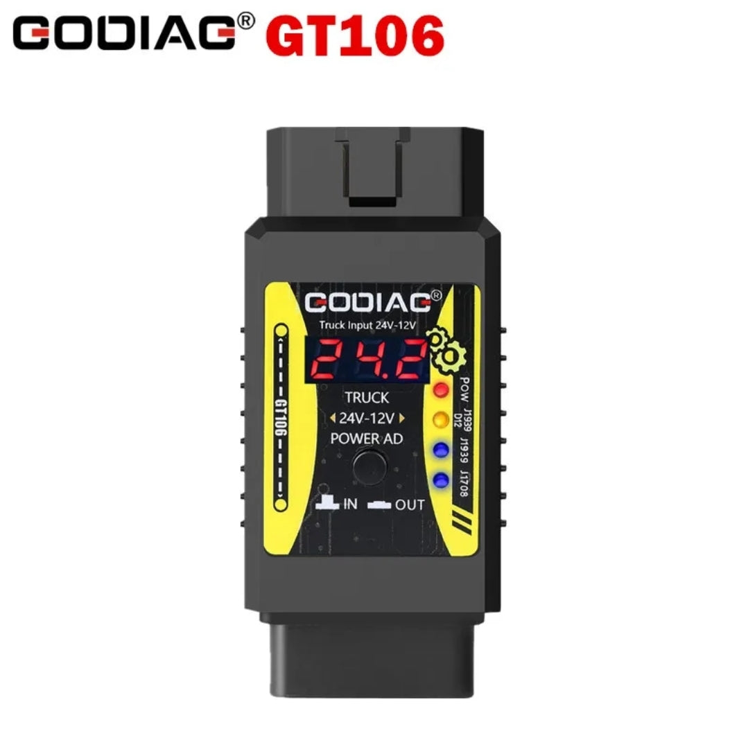 Godiag GT106 heavy truck power module converter can convert heavy truck diagnostic interface from 24v to 12v, used for X431 easydiag 3.0, easydiag 2.0, Golo Carcare 3, ICARSCAN golo technician box, ThinkCar, Thinkcar2, Thinkcar pro, Thinkdiag, Thinkdiag mini, Thinkdriver obd2 diagnostic Bluetooth head for truck diagnosis. Godiag GT106 supports any device as long as the truck software can be added on it.